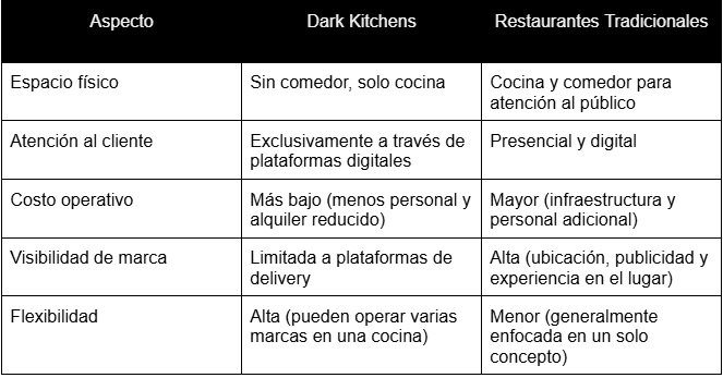 Las Dark Kitchen y los restaurantes tradicionales tienen el mismo objetivo de ofrecer alimentos de calidad al consumidor, pero existen grandes diferencias en su operación y estructura.